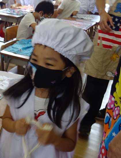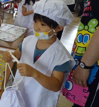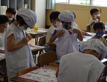 1年生は、初めての給食当番です。