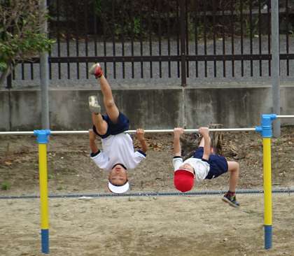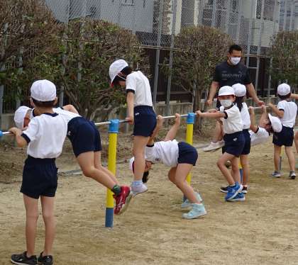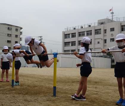 1年生は、体育の授業で鉄棒に挑戦しています。