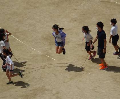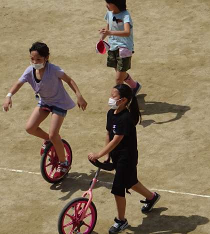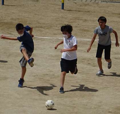 梅雨の晴れ間に、運動場で友だちと思いっきり遊ぶ子どもたち。