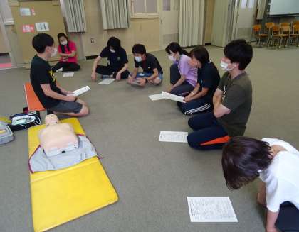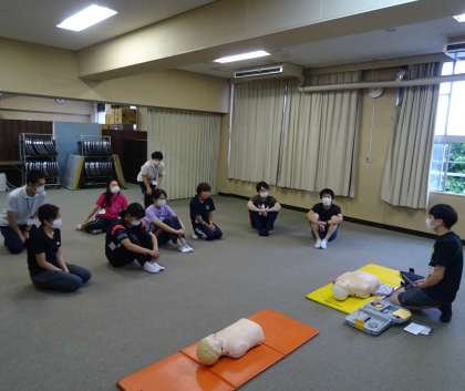 大人用と子ども用の人体模型を使い、心肺蘇生法の手順やAEDの使用方法を学びました。