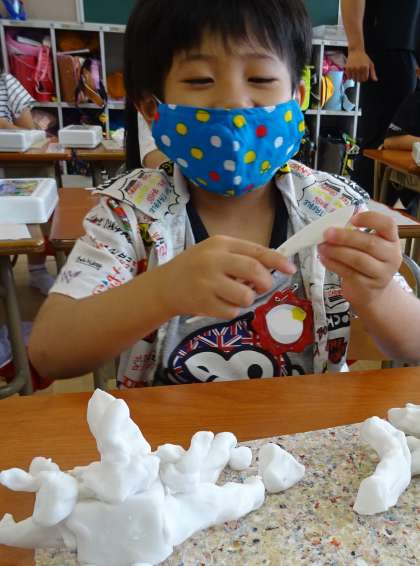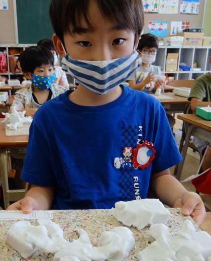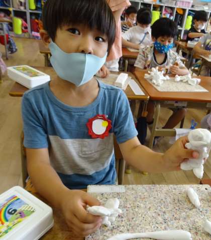 1年生が、粘土で作品を作っています。
