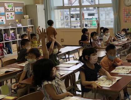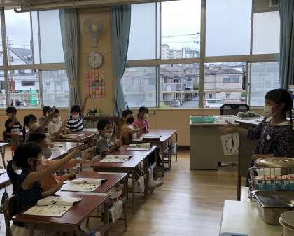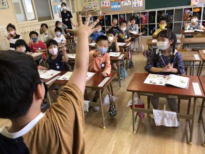 音楽の学習では、歌唱を控えているため、CDの音に合わせて体で曲を表現していました。