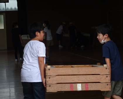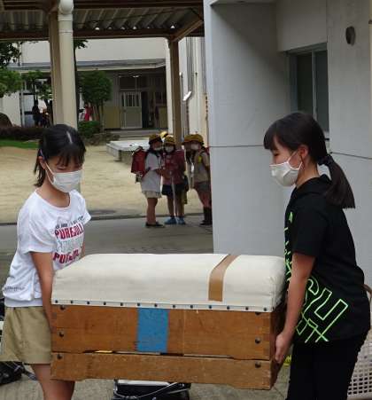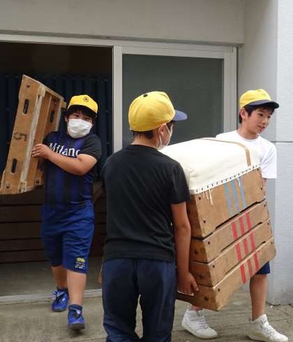 この日は、更衣室に保管していた跳び箱やマットを講堂に移動させました。