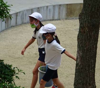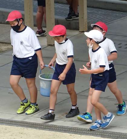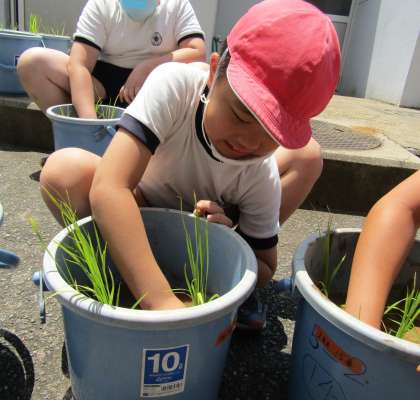植えたバケツ稲は、日当たりのよい校舎横に移動させます。