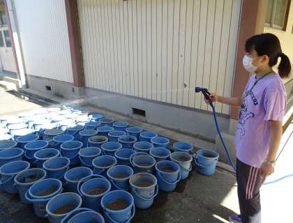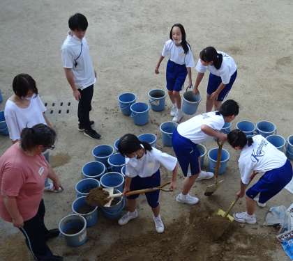 先生にあいさつに来ていた卒業生(中学1年生)が、土をバケツに入れる作業を準備を手伝ってくれました。