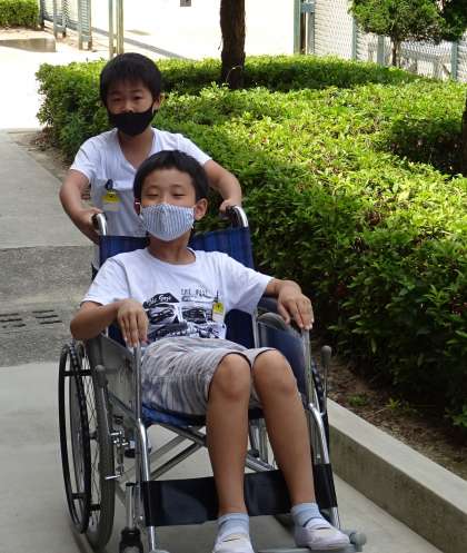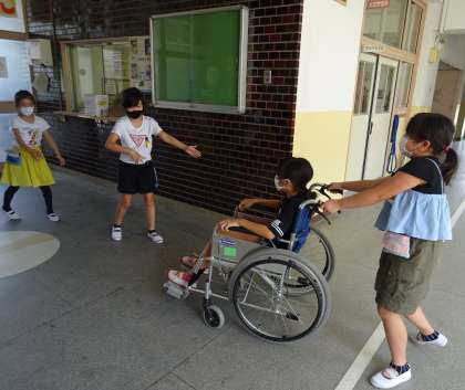グループごとに、車いすに乗る役と補助する役を交代しながら、校内のコースを2周しました。