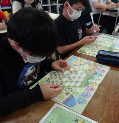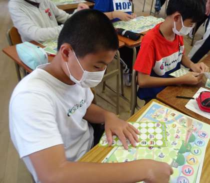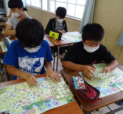 町の地図(ワークシート)に、自分が必要だと思う施設のシールを貼る活動をしている様子です。