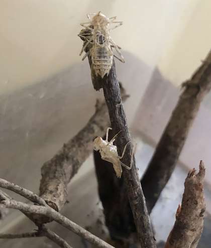 ケースに入れておいた木の枝の先端に、ヤゴのぬけがらが。