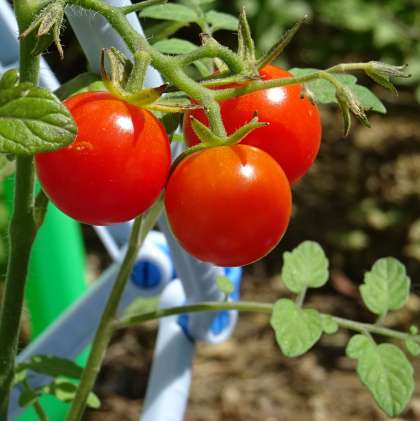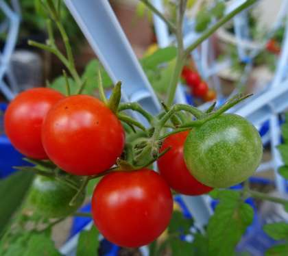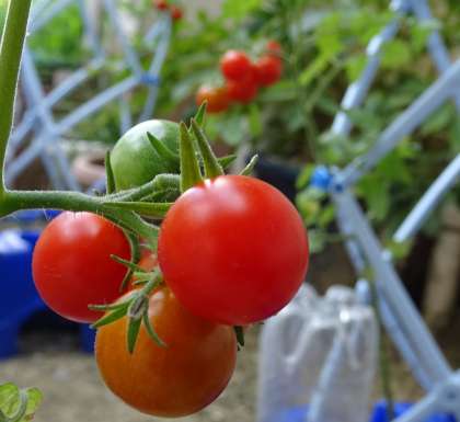 2年生が育てているミニトマトに、真っ赤な実がついています。