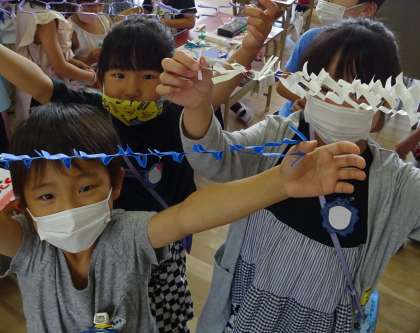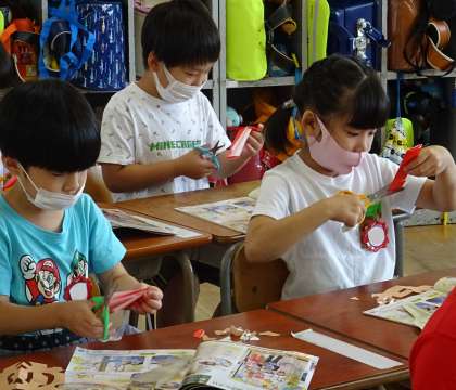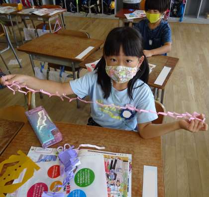 1年生が七夕飾りを作っている様子です。