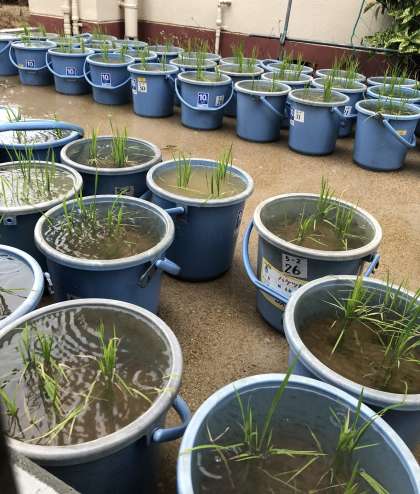 5年生が育てているバケツ稲には、水があふれるくらいにたまっていました。