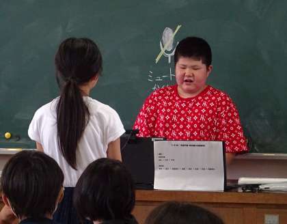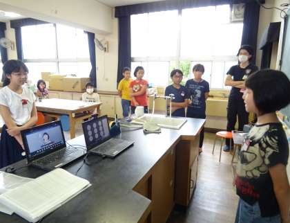 Teams(チームス)を活用した児童集会が行われ、前期の学級代表と各委員会の代表が、一人ずつ全校児童に向けてあいさつをしました。