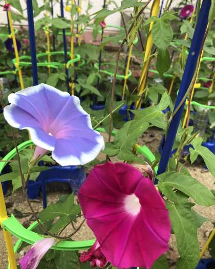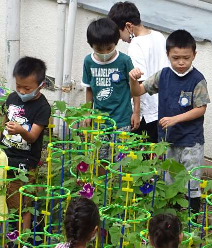 アサガオのつるは、まるでへびのようにぐるぐると巻きつきながら伸びています。