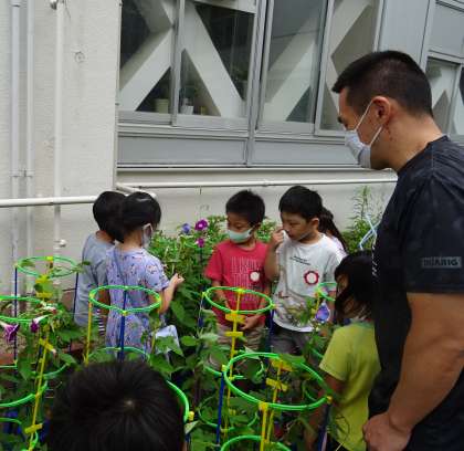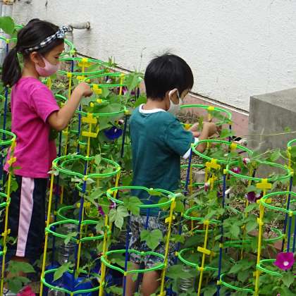 子どもたちは、自分が育てているアサガオをていねいに手入れしました。