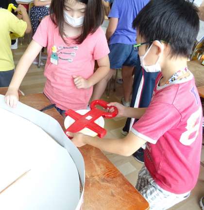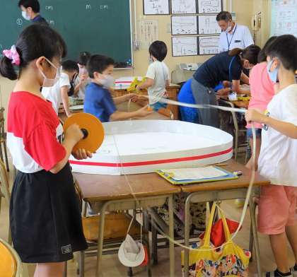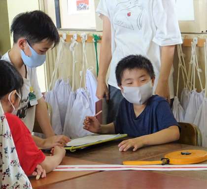 見当をつけてから、班のメンバーと協力し巻尺を使って実際の長さを測定しました。