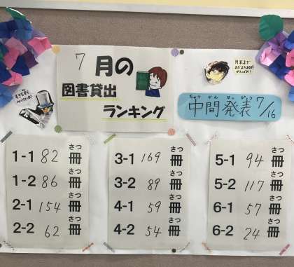 図書室前の廊下に、7月の図書貸出ランキング(7月16日現在)が貼られています。