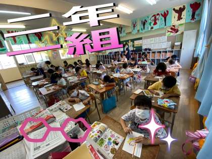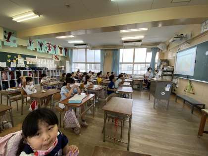 2年1組では英語をしたり、図工科ではひまわりを描いたりしました。