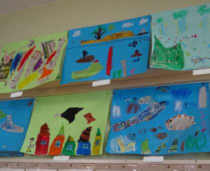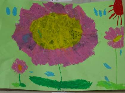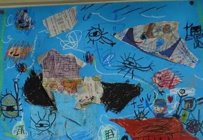 新聞紙を破いて出来た形から、想像して絵を描きました。