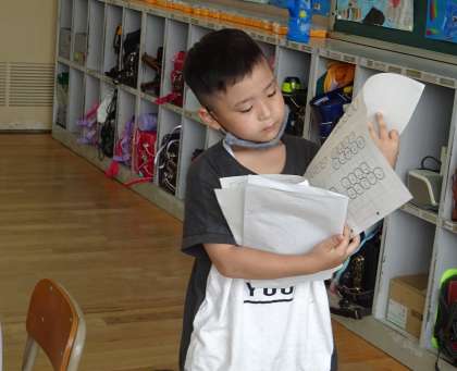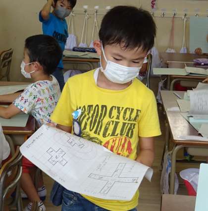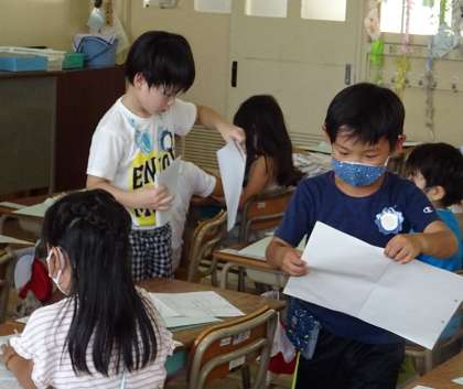 ひらがなで書かれた名前を確かめながら、クラスの友だちにプリントを配る子どもたちの様子です。