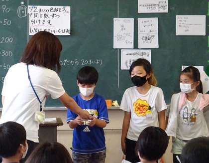 算数の授業で、割り算の問題について、みんなの前で考えを発表している様子です。