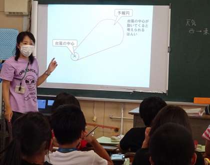 理科の授業で、台風の進路と予報円について学習している様子です。
