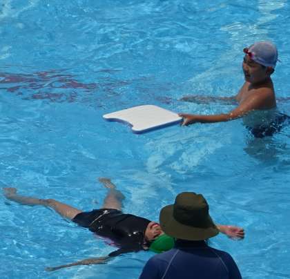(下)ビート板を使って浮く練習をしている様子です。