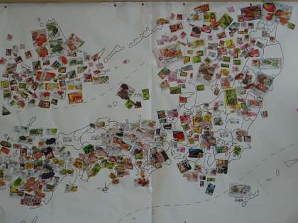 スーパーのチラシに載っている野菜や果物などの産地(都道府県)を確認し、日本地図に貼り付けていきます。