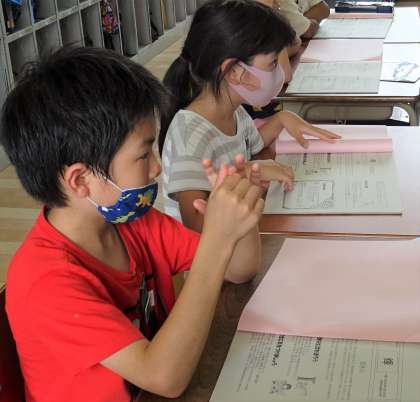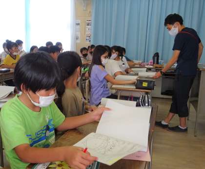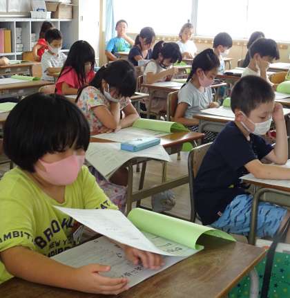 担任の先生から、夏休み中の生活や宿題(課題)についての説明を聞いている様子です。