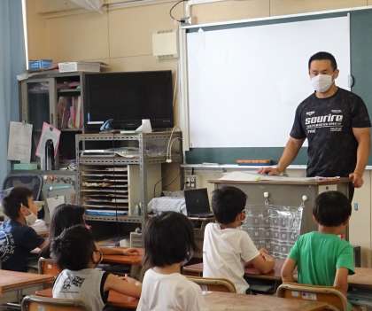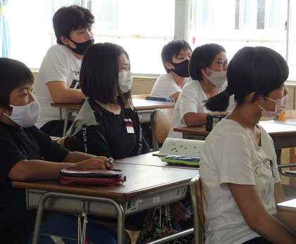 担任の先生から、夏休み中の生活や宿題(課題)についての説明を聞いている様子です。
