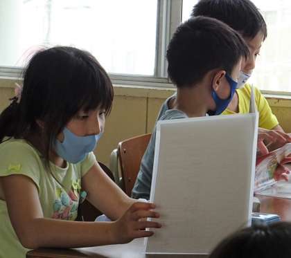 1学期の通知表を受け取っている様子です。
