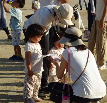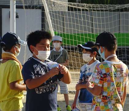 密集・密接を避けるため、PTAのスタッフが並んでいる子どもたちの所まで行って、一人ずつにスタンプを押してくれています。