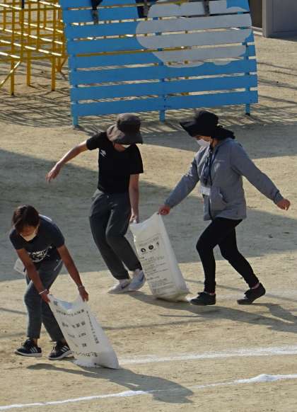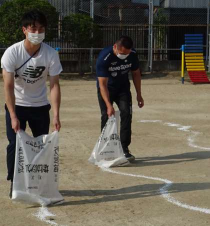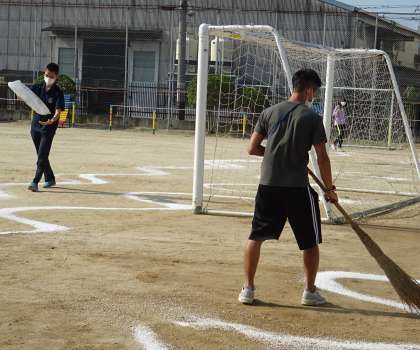 運動会の実施に向け、運動場のコンディションを整えるため、教職員によるにがりまきを行いました。