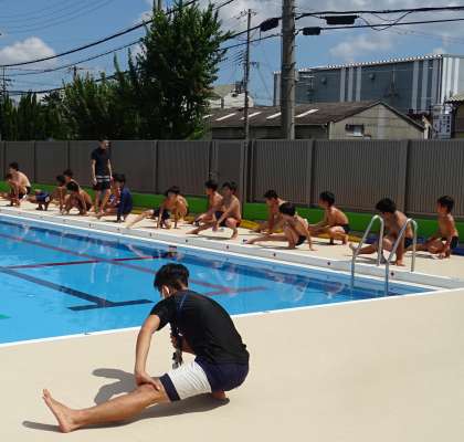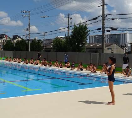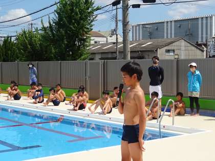 代表児童によるあいさつでオープニングセレモニーが終わると、いよいよ水泳授業の開始です。
