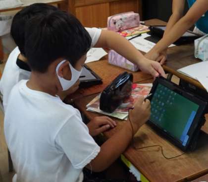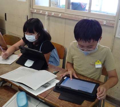 4年生は、ダンスの講師に教えてもらった「龍踊り」や地域の「だんじり祭り」について、タブレットを使った調べ学習を行いました。