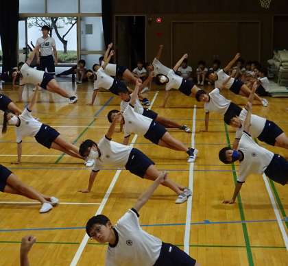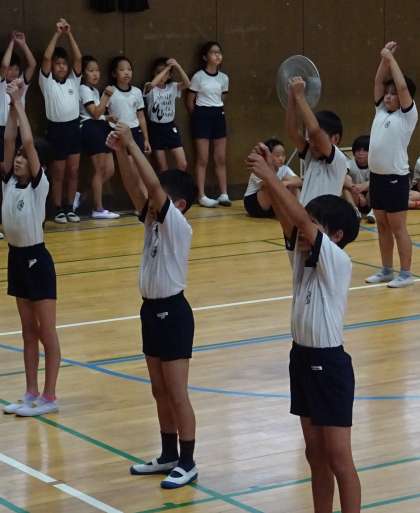 子どもたちは、手にフラッグを持った状態をイメージしながら練習に取り組んでいます。