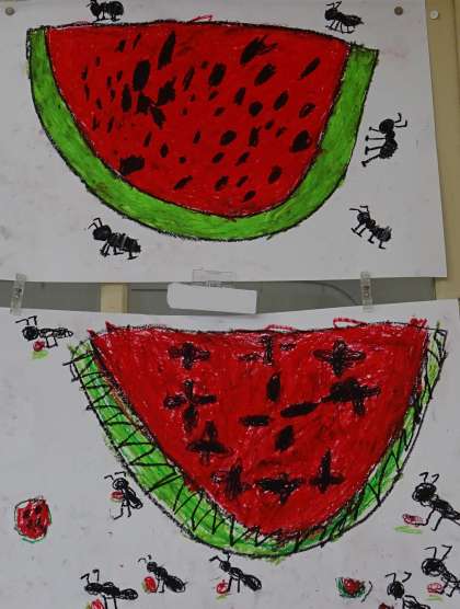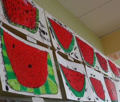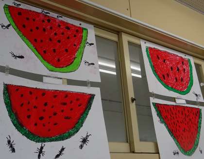 1年生の教室に、美味しそうなスイカの絵が飾られています。
