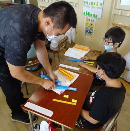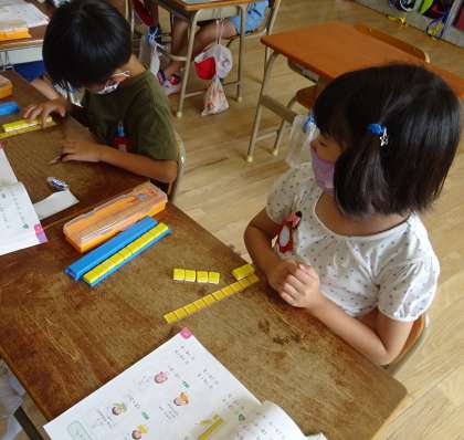 1年生が、ブロックを使って20までの数の足し算をしている様子です。