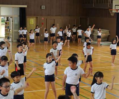 3・4年生が、運動会のダンスで披露する「龍踊り」の練習をしている様子です。