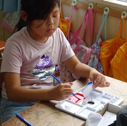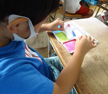 絵のぐをにじませて、キレイな模様づくりに挑戦している様子です。