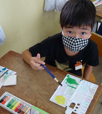 絵のぐをにじませて、キレイな模様づくりに挑戦している様子です。