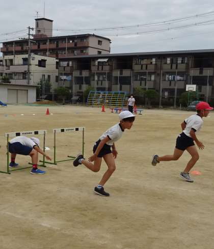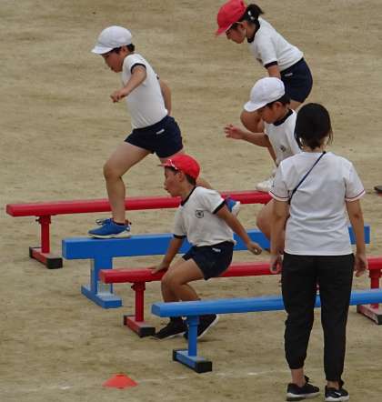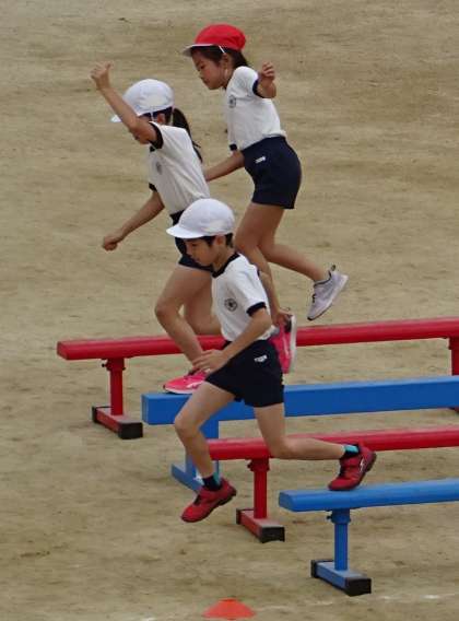 跳んだり、くぐったり、バランスをとったりしながらゴールを目指します。