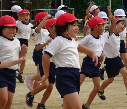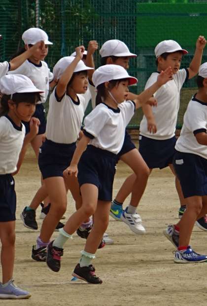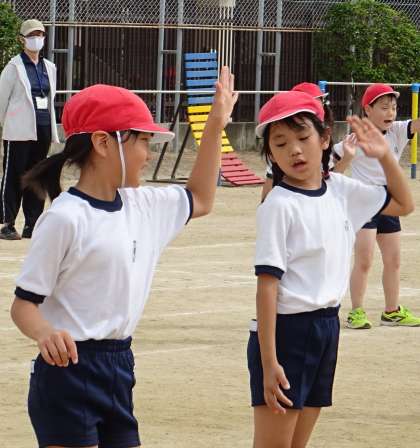 1年生と2年生が、団体演技(ダンス)の練習をしている様子です。
