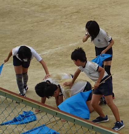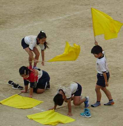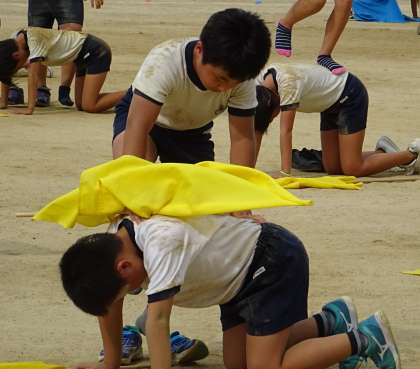 5年生と6年生が、団体演技の練習をしている様子です。