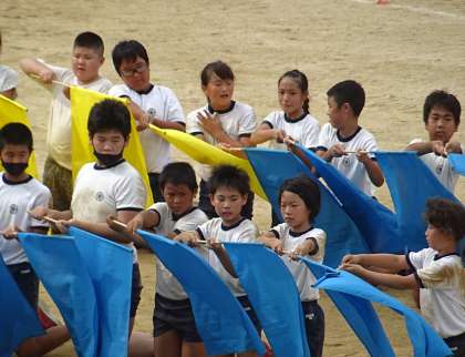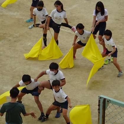 5年生と6年生が、団体演技の練習をしている様子です。