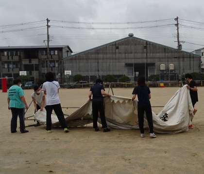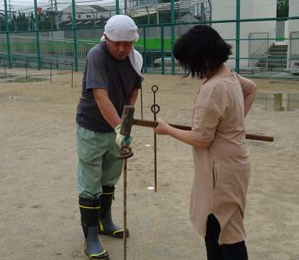 テントを張り、杭を打ち、運動会当日が晴れるのを祈ります。