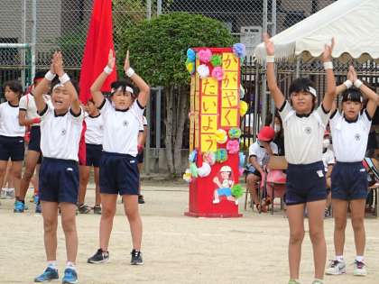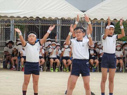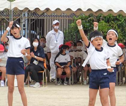 応援団の掛け声に合わせて、白組の子どもたちが手拍子をします。
