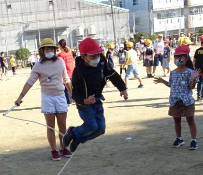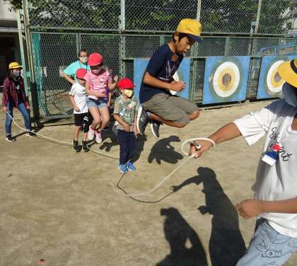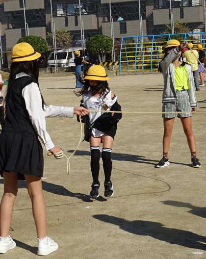 たてわり班で大縄跳びに挑戦している様子です。