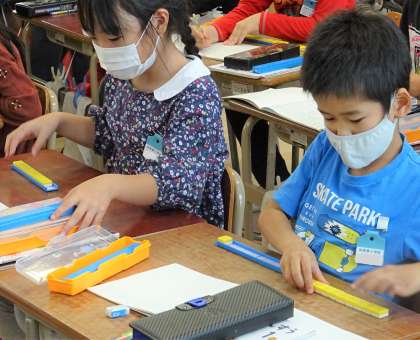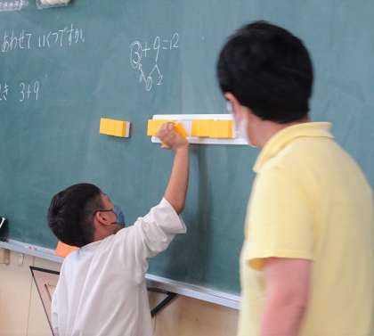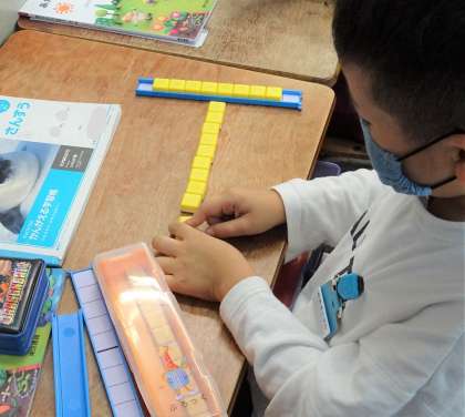 ブロックを使ったり、ノートに書いたりしながら、自分で考えてみます。