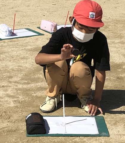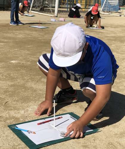 ストローで作った特製の観察用紙と方位磁針を使って、太陽とかげの位置関係を記録します。