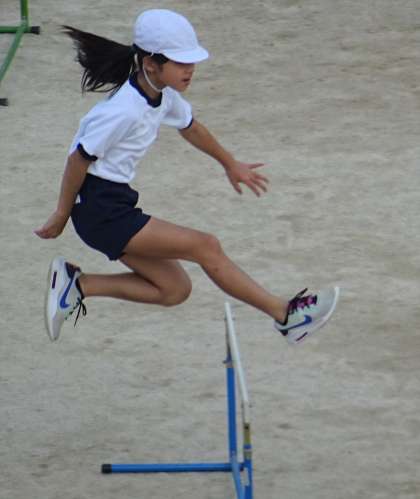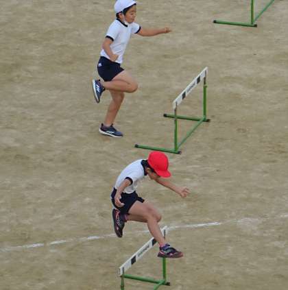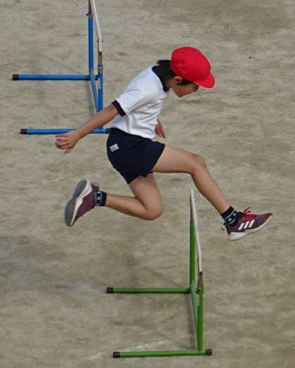 ハードル走は、歩幅を合わせて跳び越すのと、いかにスピードを落とさずに走るのかがポイントです。